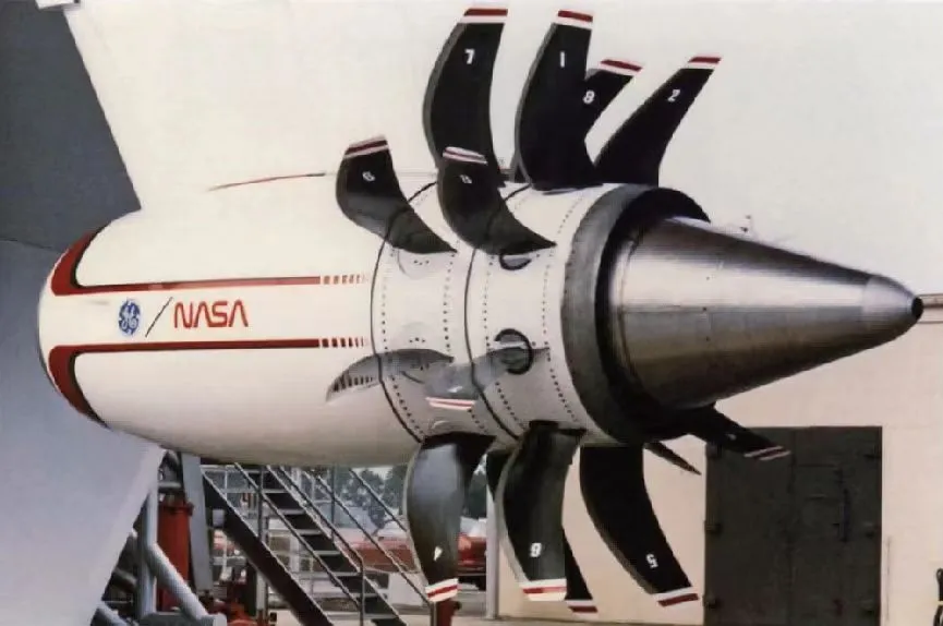 ??槳扇發(fā)動機(jī)最大的特征在于直接甩掉渦扇發(fā)動機(jī)的涵道外殼,讓葉片暴露在空氣中,這樣既去掉了笨重的短艙,又大幅度增加了涵道比,從而降低了燃油消耗,一舉兩得。