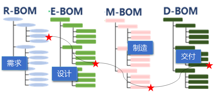 ??下圖中小紅星代表了我們要找的零件的一個(gè)具體信息,它在不同的業(yè)務(wù)階段可能在不同的“樹(shù)杈”上,但這四棵不同的“樹(shù)”之間可以通過(guò)固定的邏輯進(jìn)行溯源,因?yàn)樗鼈兊谋举|(zhì)都是產(chǎn)品的分解架構(gòu),只是視角不同而已。如此一來(lái),我們要找的目標(biāo)零件信息就不再是數(shù)據(jù)海洋中漂流的孤島,而是被X-BOM這棵大樹(shù)緊緊串聯(lián)在一起,不論漂到哪兒,都能找到自己的“前世今生”。